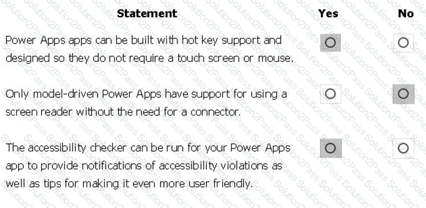 You are creating a model-driven Power Apps app. You want to ensure that the app can be used by individuals who have vision impairments.