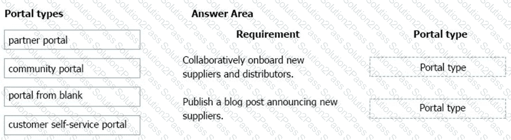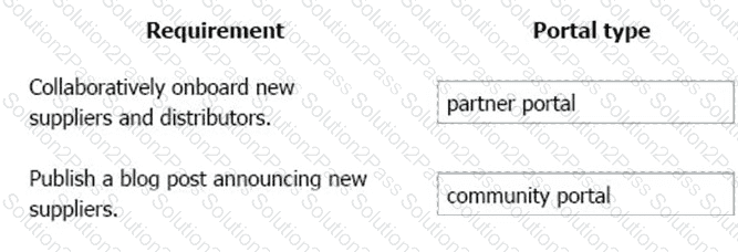 Which portal types should you use? To answer, drag the appropriate portal types to the correct requirements. Each portal type may be used once, more than once, or not at all. You may need to drag the split bar between panes or scroll to view content.