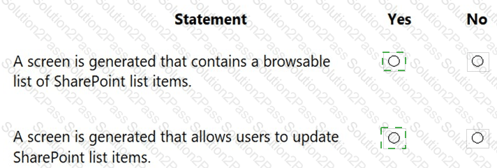 You create a canvas app by using the Generate from data feature. The app connects to a Microsoft SharePoint list.
