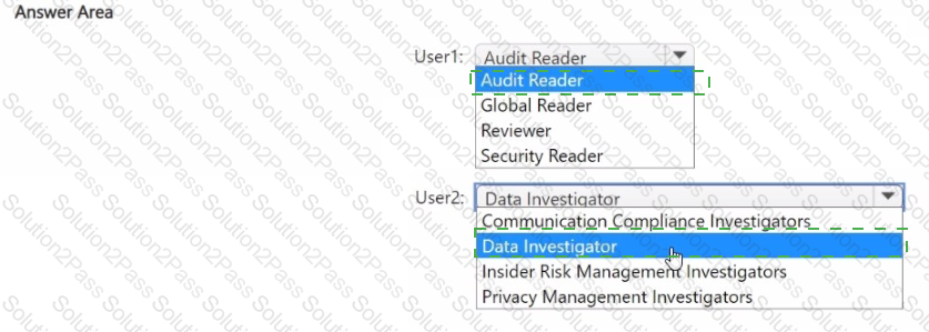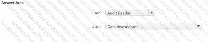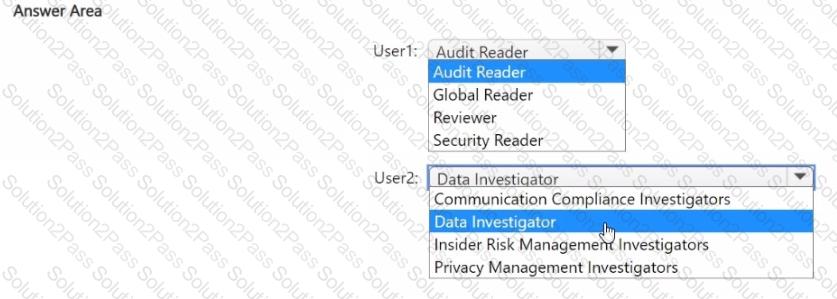 To which Microsoft Purview role group should you add each user? To answer, select the appropriate options in the answer area.