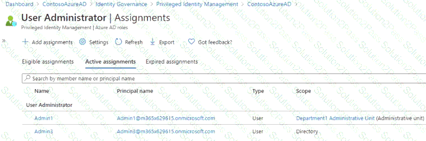 The User Administrator role assignments are shown in the Assignments exhibit. (Click the Assignments tab.)