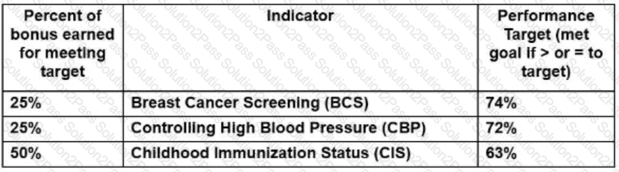 Each provider in a primary care practice has the potential of earning a $20,000 bonus based on individual performance on select Healthcare Effectiveness Data and Information Set (HEDIS) indicators as outlined below: