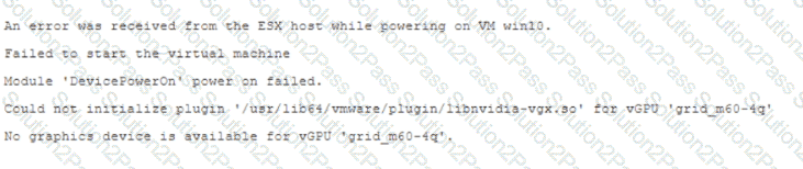A Windows IO VM fails to power on With an NVIDIA vCPU profile in ESXi 7. The VM is configured with NVIDIA profile by selecting Shared PCl Device, adding the NVIDIA GRID vCPU device. and selecting the Profile under VM settings.