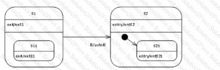 Which sequence of behavior executions occurs if the state machine below is in state S11 and an event of type E occurs?