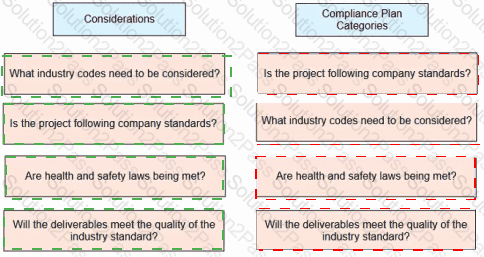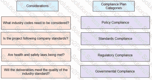 A project manager is leading a project in a heavily regulated industry. Match the considerations on the left with the correct compliance plan categories on the right.