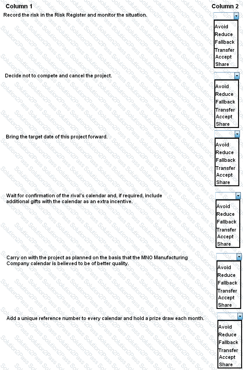 Column 1 contains a number of risk responses identified by the Project Manager following an assessment of this risk. Column 2 contains a list of threat response types. For each risk response in Column 1, select from Column 2 the type of response it represents. Each option from Column 2 can be used once, more than once or not at all.