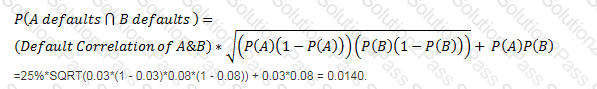 There are two bonds in a portfolio, each with a market value of $50m. The probability of default of the two bonds are 0.03 and 0.08 respectively, over a one year horizon. If the probability of the two bonds defaulting simultaneously is 1.4%, what is the default correlation between the two?