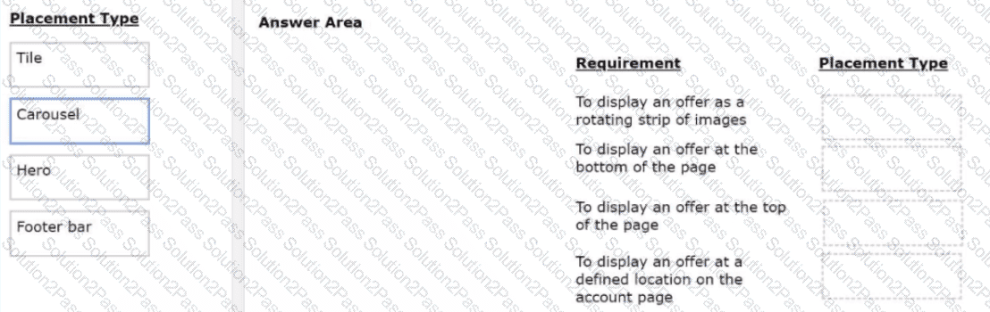U+ Bank has decided to use the Pega Customer Decision Hub, M to recommend more relevant banner ads to its customers when they visit the personal portal. Select each placement type on the left and drag it to the correct requirement on the right.