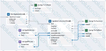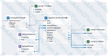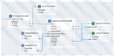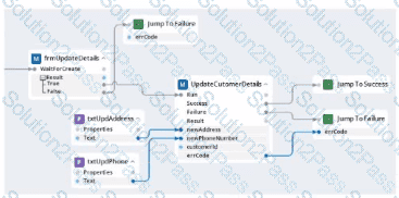 Within your project for a car renting company, you create an automation that reads data From an online form and calls a subautomation that saves that data in the company's application. The UpdateCustomerDetails subautomation has two exit points, Success and Failure, and two output parameters. Result and errCode.