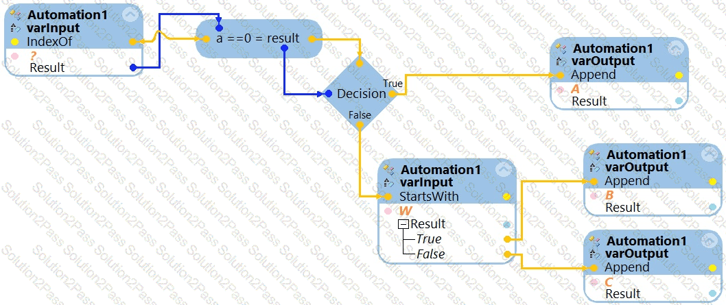 The business requirements states that the login automation creates a Success or Failed response when attempting to log in to the finance application. If a failure occurs, the automation should pass a message code with the Message Manifest before exiting the automation.