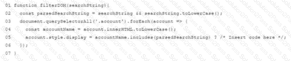 Which code should replace the placeholder comment on line 06 to hide accounts that do not match the search string?