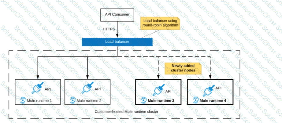 An organization uses a 2-node Mute runtime cluster to host one stateless API implementation. The API is accessed over HTTPS through a load balancer that uses round-robin for load distribution.