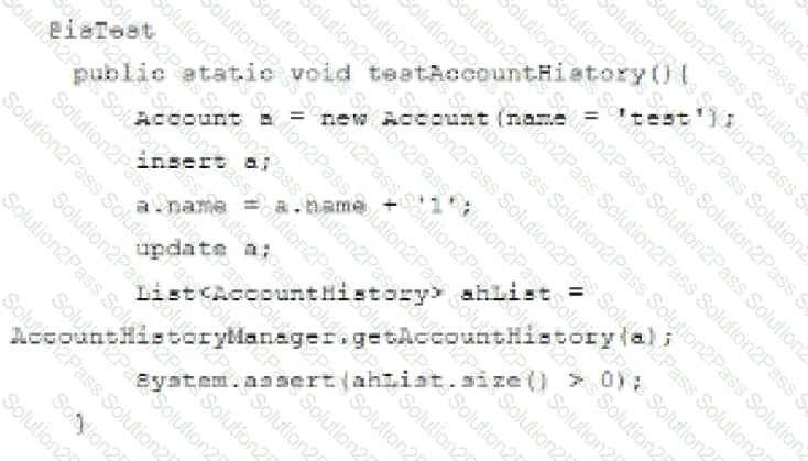 A developer wrote a class named asccuntRisteryManager that relies on field history tracking. The class has a static method called getaccountHistory that Lakes in an Account as a parameter and returns a list of associated accountHistory object records.
