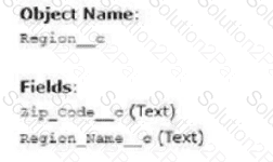 The Salesforce admin et Cloud Kicks created a custom object called Region_c to store all postal zip codes in the United States and the Cloud Kicks sales region the zip code belongs to.