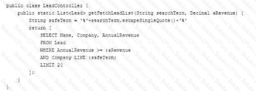 A developer created a JavaScript function as part of a Lightning web component (LWC) that surfaces information about Leads by wire calling geyFetchLeadList whencertain criteria are met.