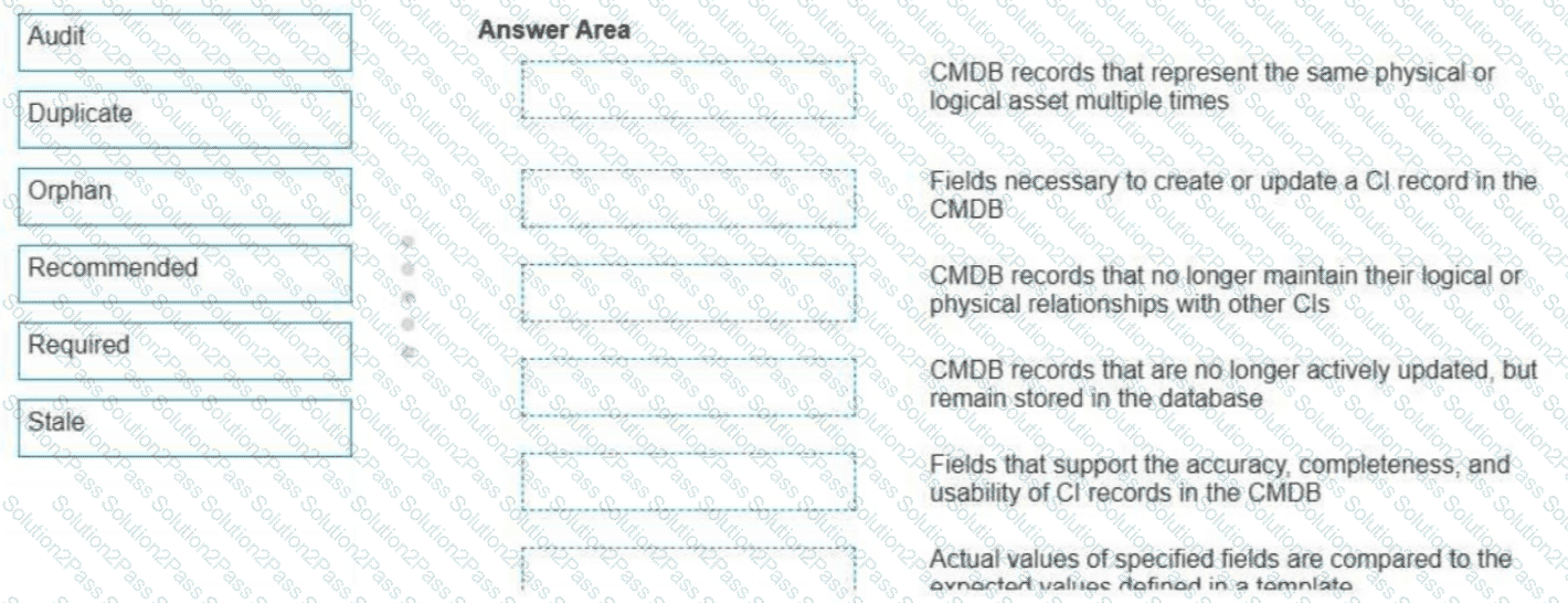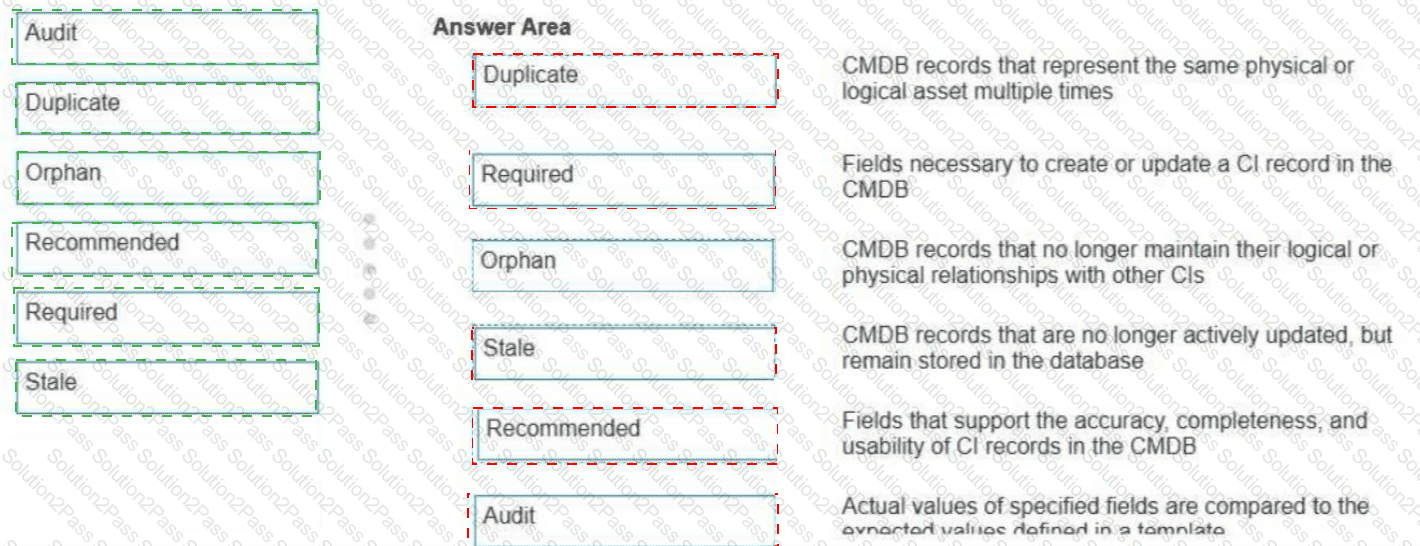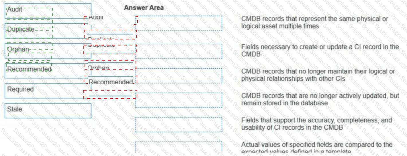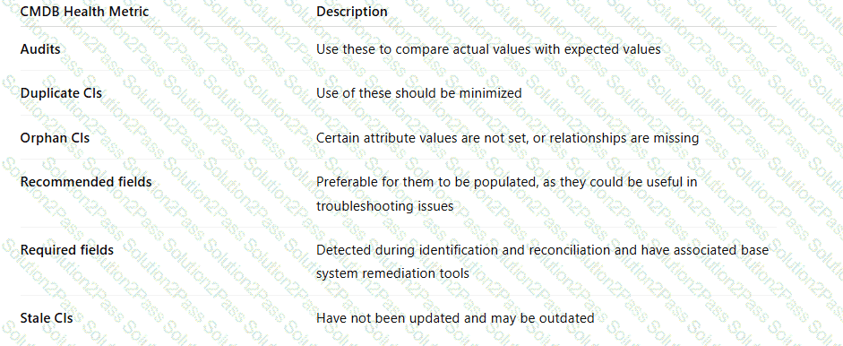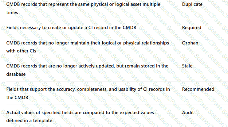 Drag and drop the CMDB Health Dashboard metric to the correct description.