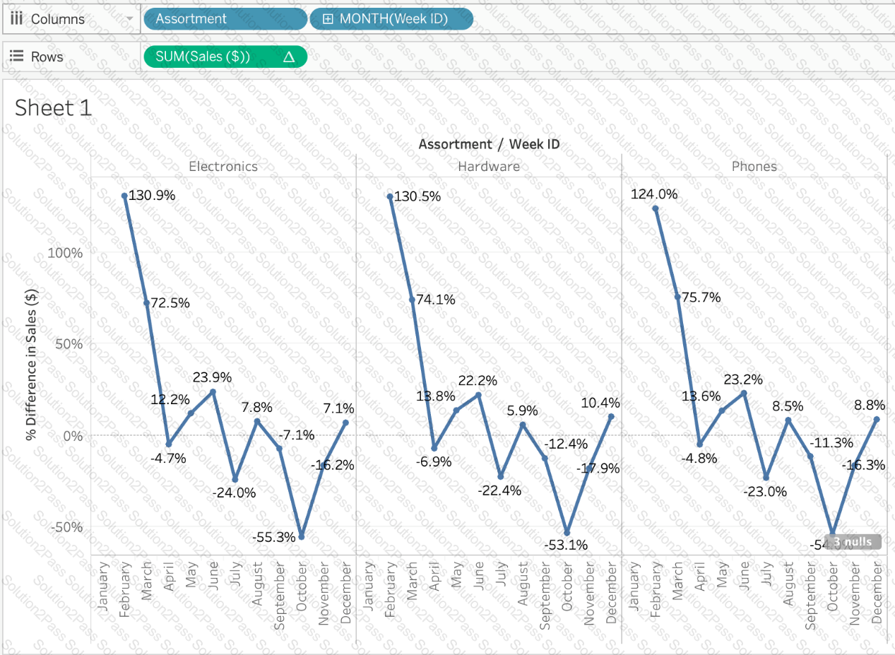 Using the Time Series Table, create a Line chart showing the Monthly Year over Year Growth for the Sales, broken down by Assortment. For the Electronics assortment, which Month had the most NEGATIVE value of Year over Year Growth?