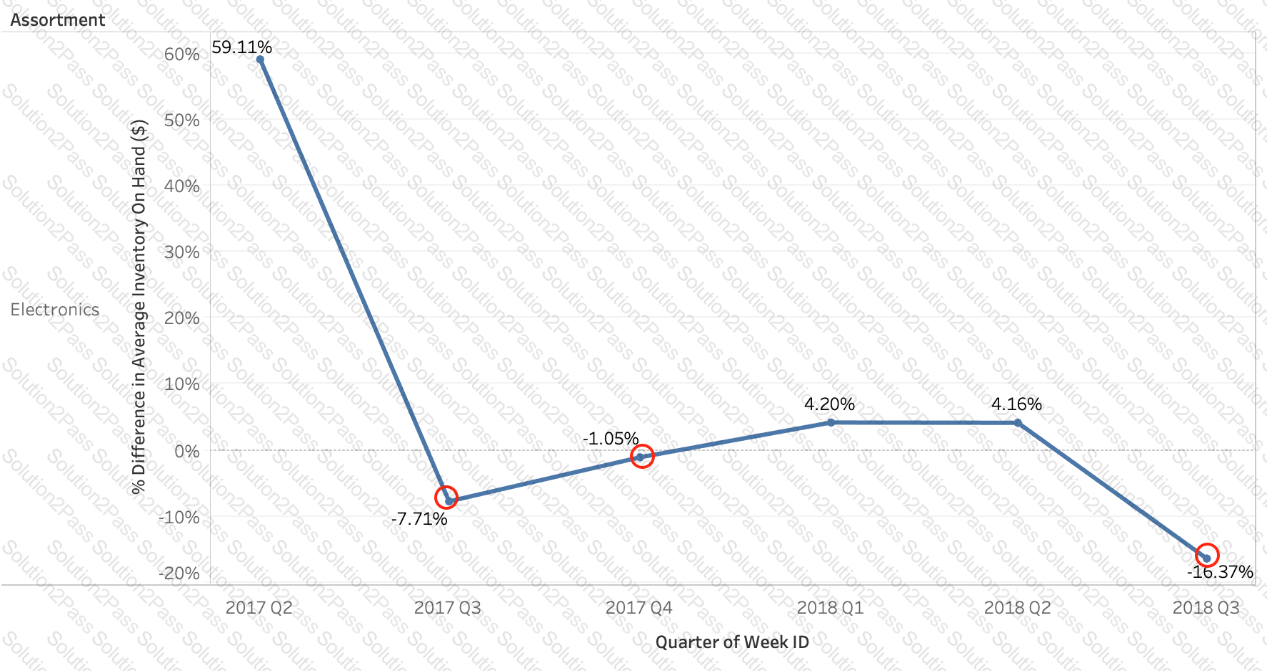 Using the Time Series table, create a chart that shows the percent difference in Average Inventory on Hand for each Assortment by year and quarter.