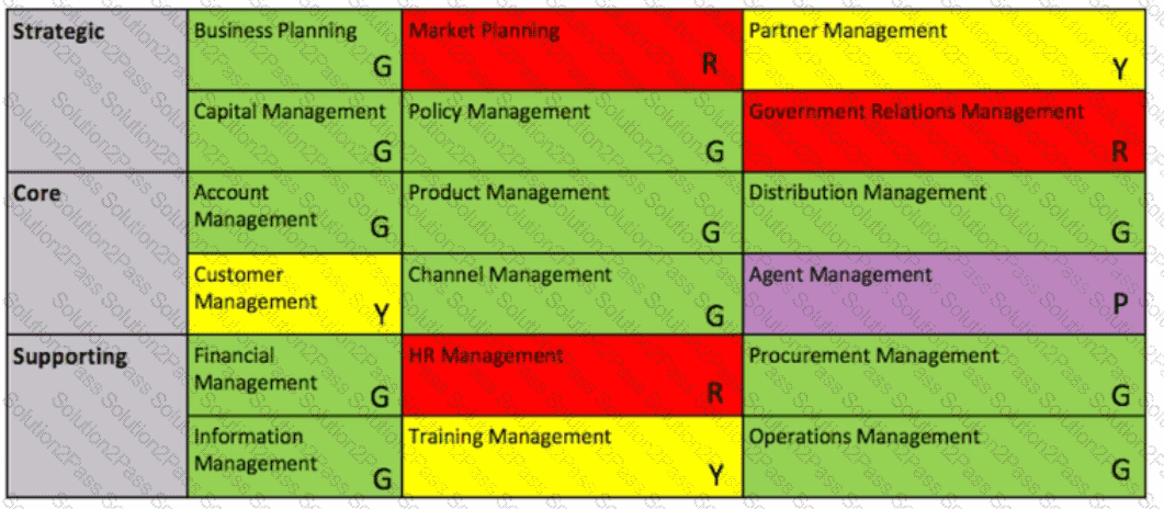 Consider the following business capability map. where cells of a model are given different colors to represent maturity levels (note the letters G, R. Y. P also denote the colors used = Green, Red. Yellow and Purple):