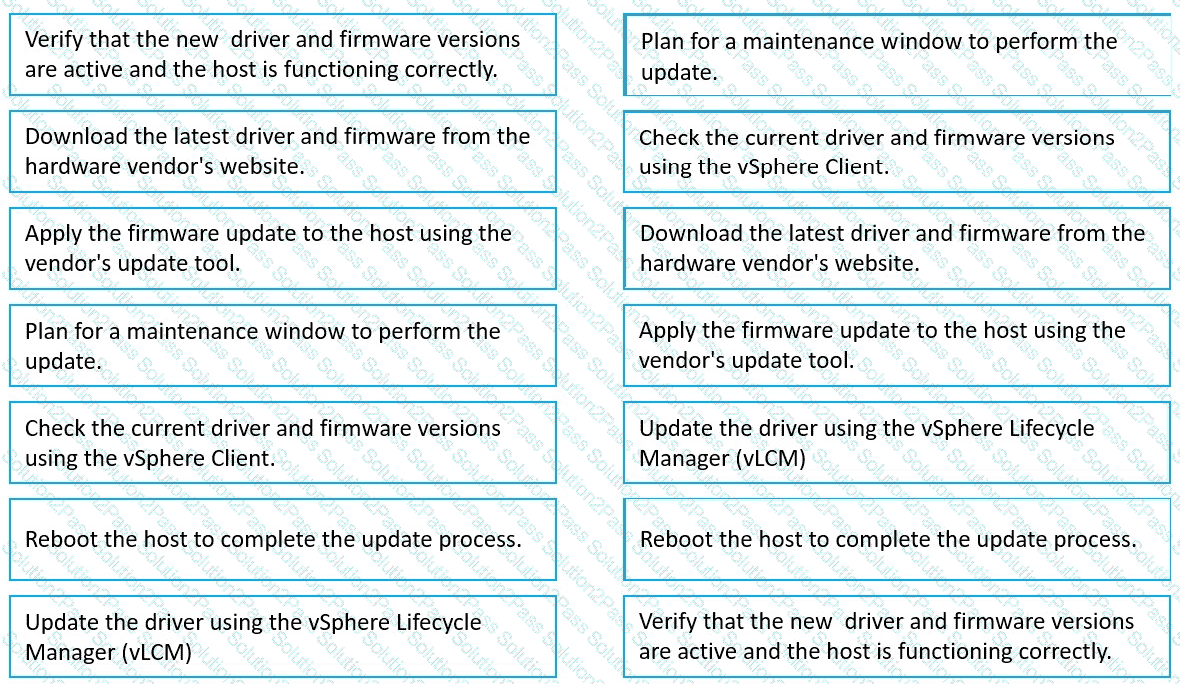 Put the following steps in the correct order to update the driver/firmware in vSAN.