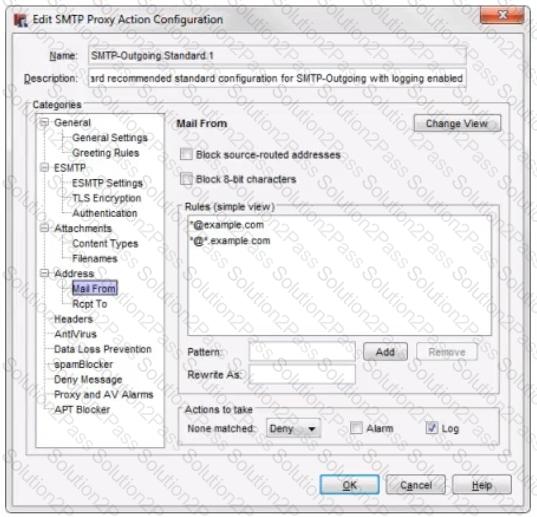 From the SMTP proxy action settings in this image, which of these options is configured for outgoing SMTP traffic? (Select one.)